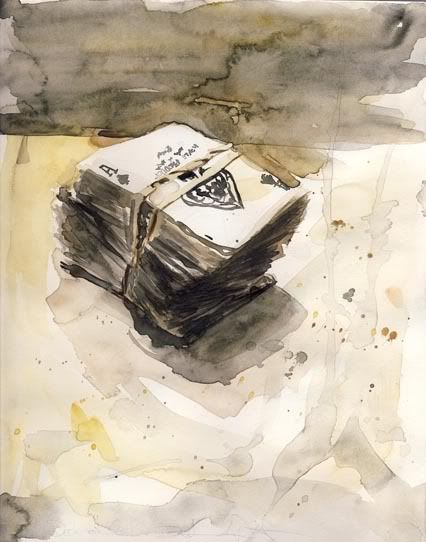 So I've had this particular idea sitting around my apartment for quite awhile. I thought it was quite intimidating but once I started painting I realized it really was quite simple. I'm not sure how successful I am at showing that there's about two decks in that mess or even that there are a lot of cards but I like most of the result. I'm not a big fan of the uppermost corner of the cards though.